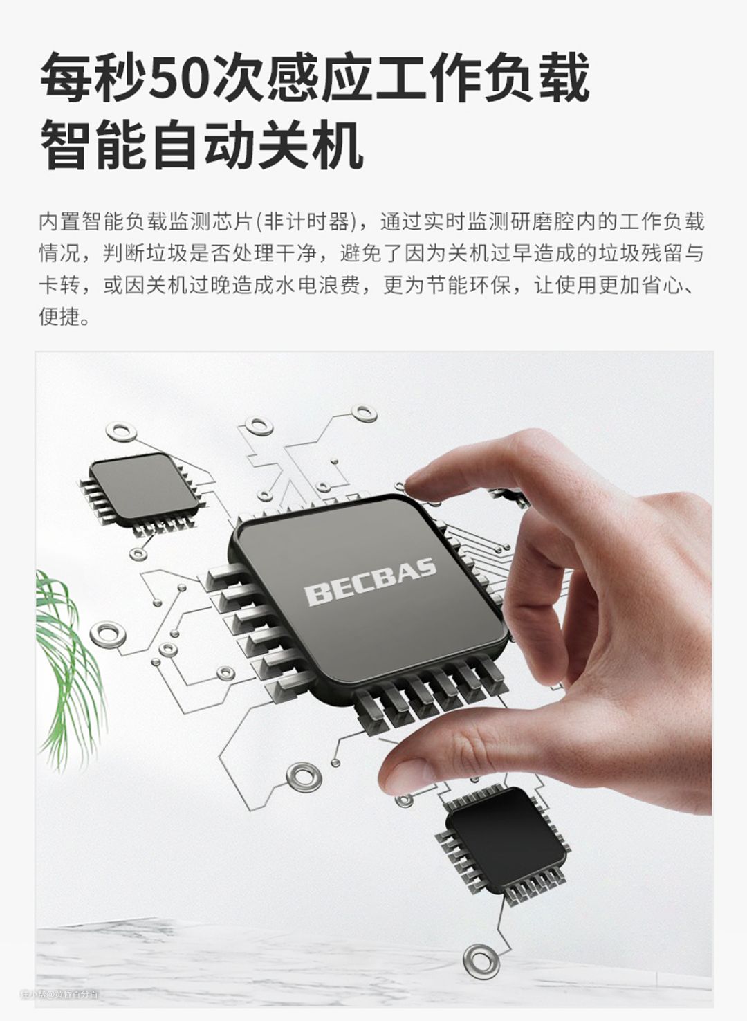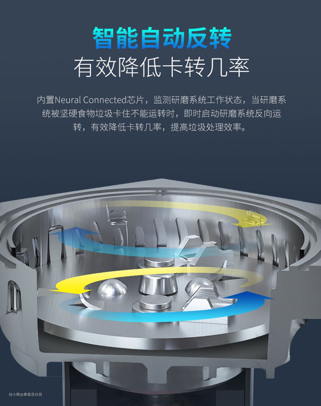 ▲为了防止过硬大的异物进入厨房垃圾处理器而造成研磨盘被卡死,贝克巴斯EMAX内置了Neural Connected芯片,研磨盘遇到硬物卡顿会自动反转,排除异物,有效降低研磨盘卡住的几率。