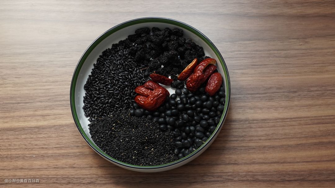 ▲我家有两个掉毛怪,分别是我家的猫和我家女王大人,猫掉毛的问题已经没救了,不过我家女王说这个五黑豆浆可以生发防脱,所以我们首先来做这个吧。材料很简单,黑豆、黑芝麻、黑米各自15g,桑葚8g,黑枣3颗,这里我家没有黑枣,所以用红枣代替了。