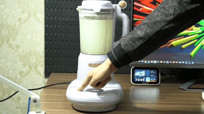 ▲这款七彩叮当破壁机,支持玉米汁、奶昔、五谷、浓汤、豆浆、米糊、绵粥、果蔬8大模式,直接一键选择不费心;点按四周的触控键切换其他功能,比如,智能双预约,最长12小时预约功能,平常使用的时候可以直接选择功能,把盖子的安全卡扣扣好,点击开始即可。
