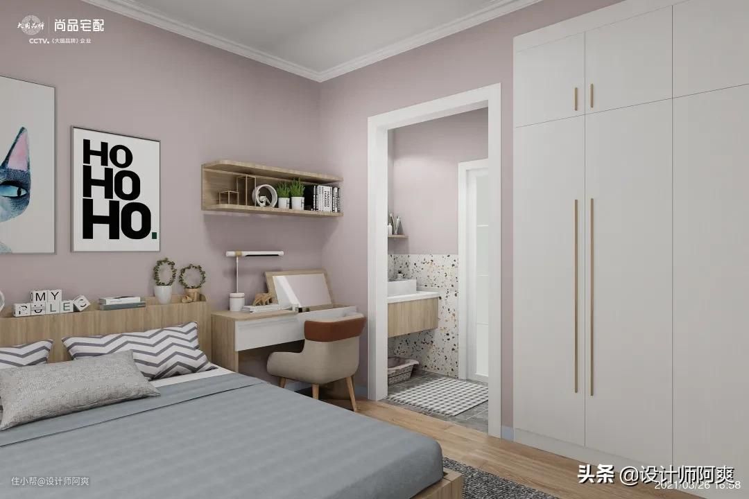 ▲ 粉+白+原木,卧室搭配很温馨,主卫将盥洗区移出,更方便使用。主卫用灰+白,放大空间。