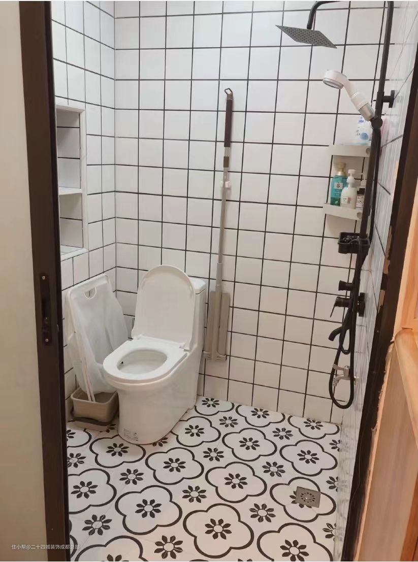 卫生间内面积比较小,一个马桶,留个淋浴空间,面积基本上都用完了,就在墙面想办法,马桶侧面的墙上掏了个洞,做了壁龛,可以存放一些生活用品。
