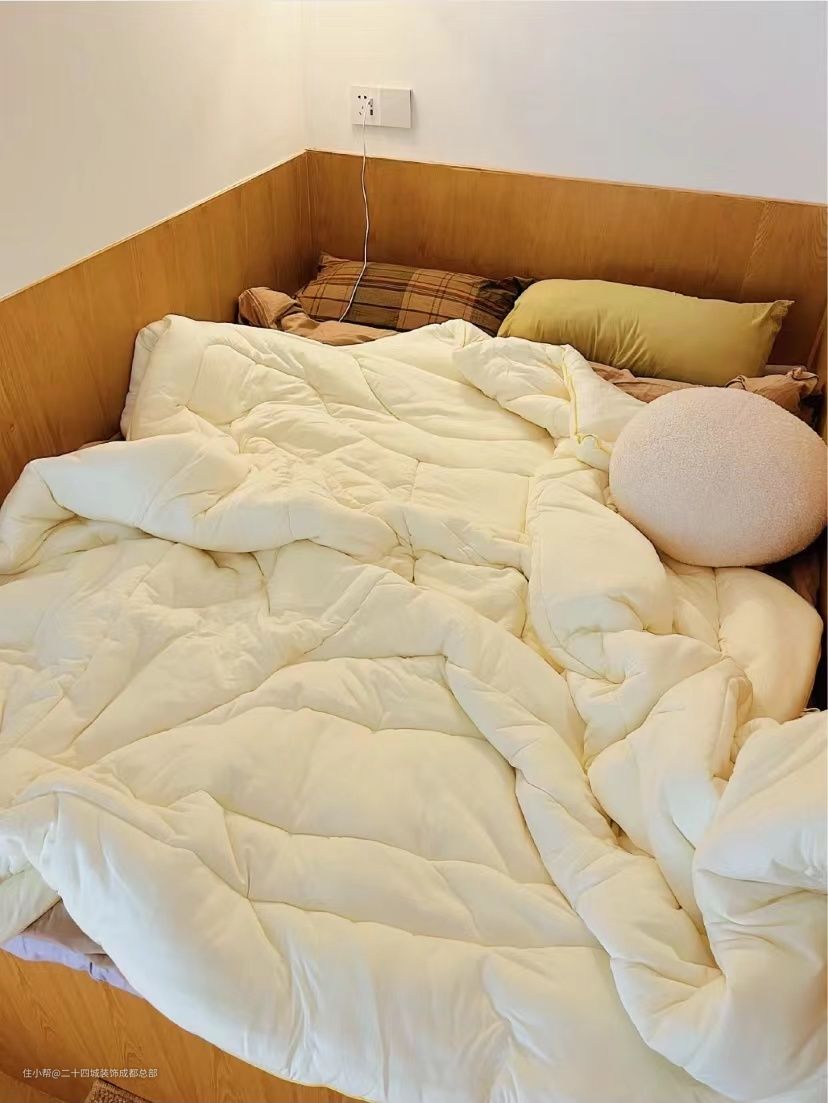 让木工师傅用木工板把床的位置在高度上分割成了两半,上面的空间是女主的卧室区域,下面的空间就是狗狗房了。