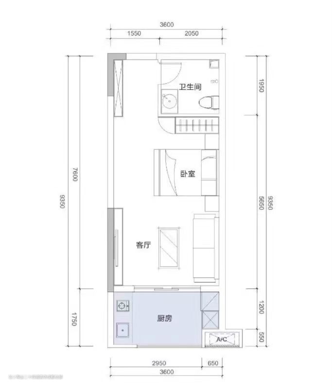室内面积30㎡,是一厨一卫一厅一室的小公寓: