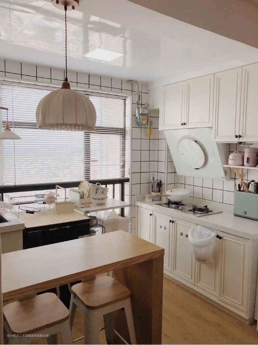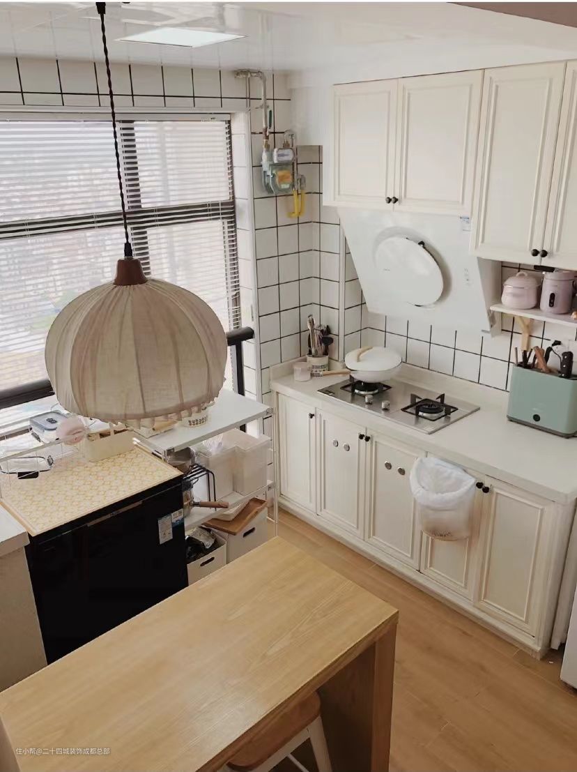 左侧做了个L型的桌子,既是个吧台又是女主的餐桌,侧面的桌面上还可以放烤箱、电饭煲、开水壶等厨房小家电,也能很好的分担厨房的摆放压力。顶面的吊柜可以存放酒杯和红酒等,拿酒倒酒坐下,小酌一杯,一气呵成,非常的方便。