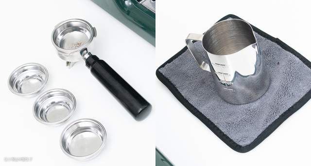 ▼配件有四支粉碗,单杯量和双杯量的各两支,以及一个不锈钢奶缸以及清洁布一块。