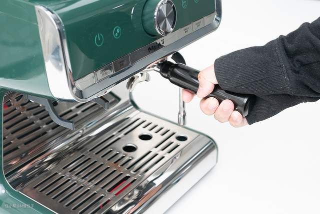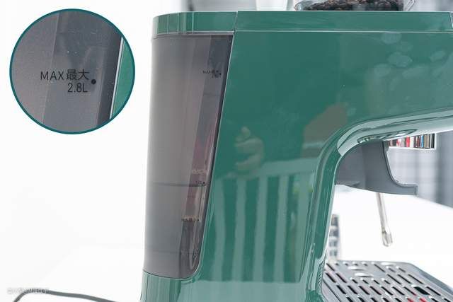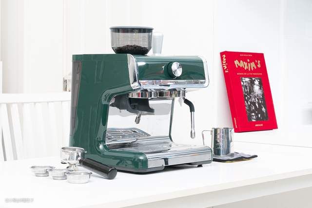 ▼首先来看看这款咖啡机的外观吧。整体是墨绿色的配色,辅以不锈钢的勾勒,复古的风格,一眼就爱上。