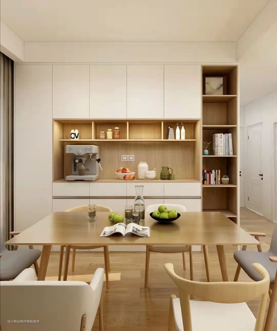 客厅书柜一餐边柜,整个柜子包含了开放格、玻璃展示柜、收纳吊柜地柜、收纳抽屉、转角开放柜。吊柜与地柜做了不同的深度,体现出空间的层次感。