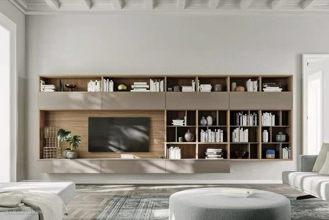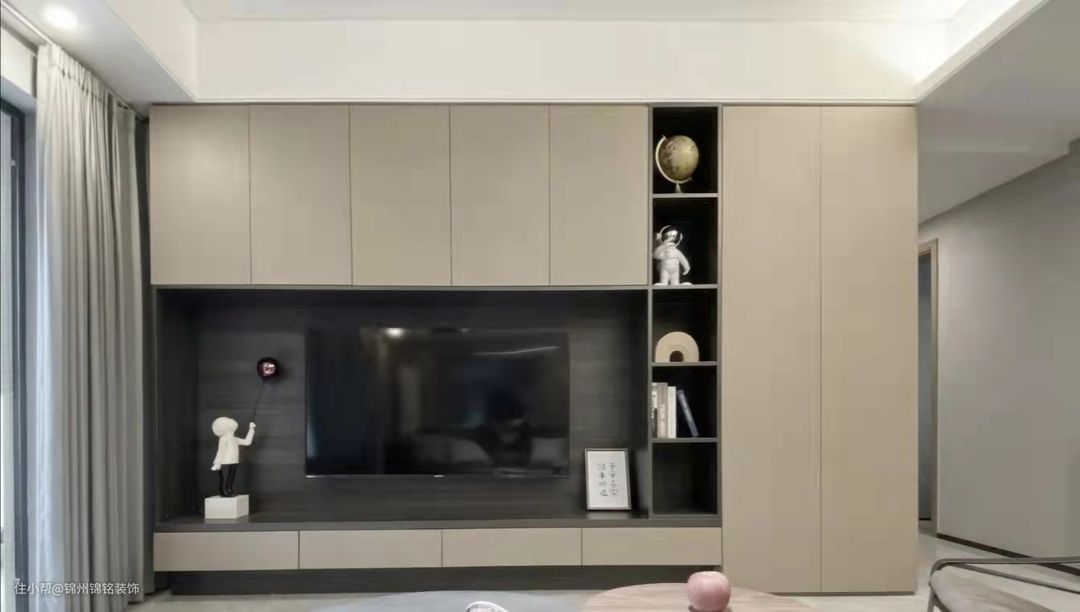 柜子悬空打在墙面,底部留空。整墙电视柜把电视居中内嵌,保证观影效果,柜体藏露结合,展示区摆放书籍、工艺品,为客厅增添艺术气息,下方做悬空展示设计,搭配灯带设计,营造出轻盈简约的美感。