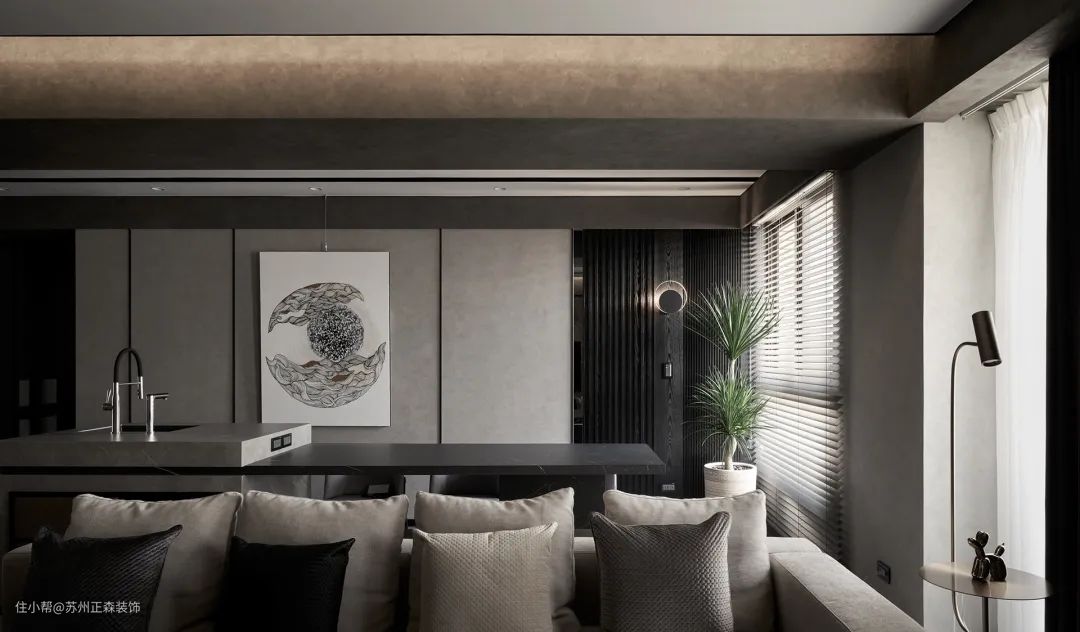 借助自然光的照射与白色布艺的衬托,以含蓄的方式来环节黑白灰带给空间的肃穆感,达到美学与舒适性的平衡。