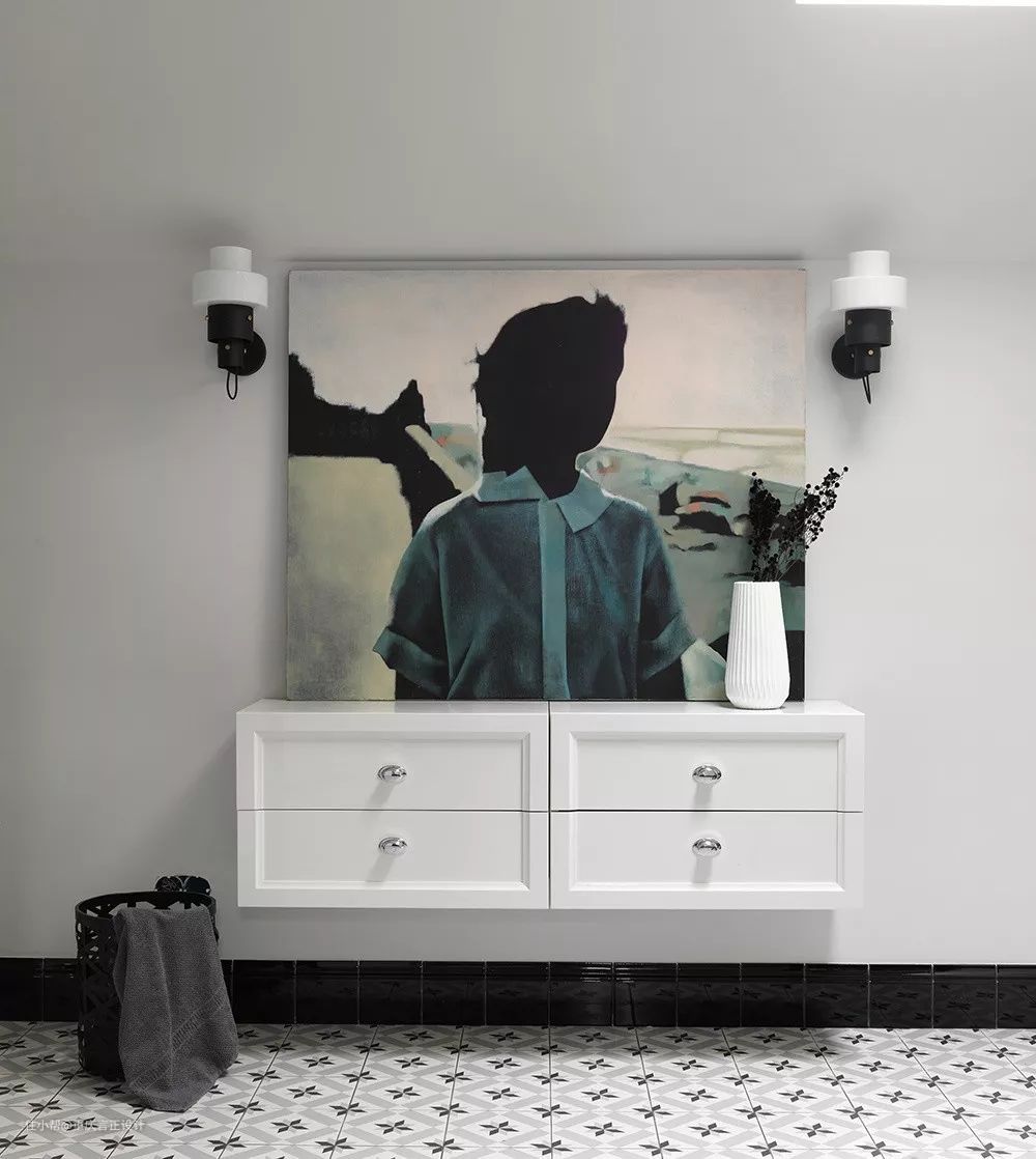 室内黑白色调的理想解决方案-单色绘画。至少在这个小空间里,所有的东西都显示出和谐,