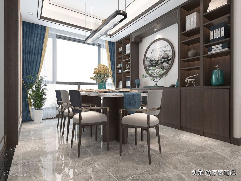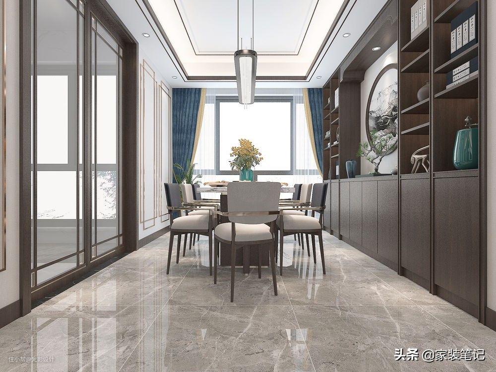 餐厅和客厅还有主卧室一样,都是把旁边的阳台纳入进来,所以拥有超舒适的落地窗,总体下来这个房子的采光效果是非常好的,从前面的主卧室到客厅,最后到这个餐厅空间都是如此。在空白墙面没有做其他的装饰,选择用金属线条来点缀,能够弱化中式的沉闷,达到新中式风格的时尚前卫效果。