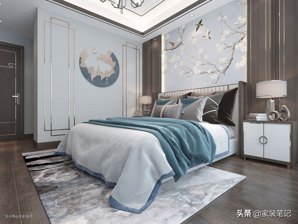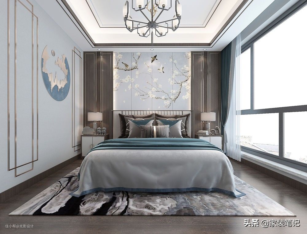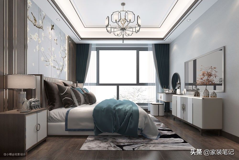 主卧室拥有大的落地窗,给了卧室里面很强的自然采光效果。主卧床头延续了中式对称美的设计方式,中间做一幅画,体现出了中式的诗情画意,让卧室充满了文化古韵在里面,为了让整体不显沉闷,所以在墙面加了一些金属元素进去,这样就打造出了一个亦古亦今的卧室氛围出来。床尾墙面悬挂电视机,摆放电视机柜和梳妆台。