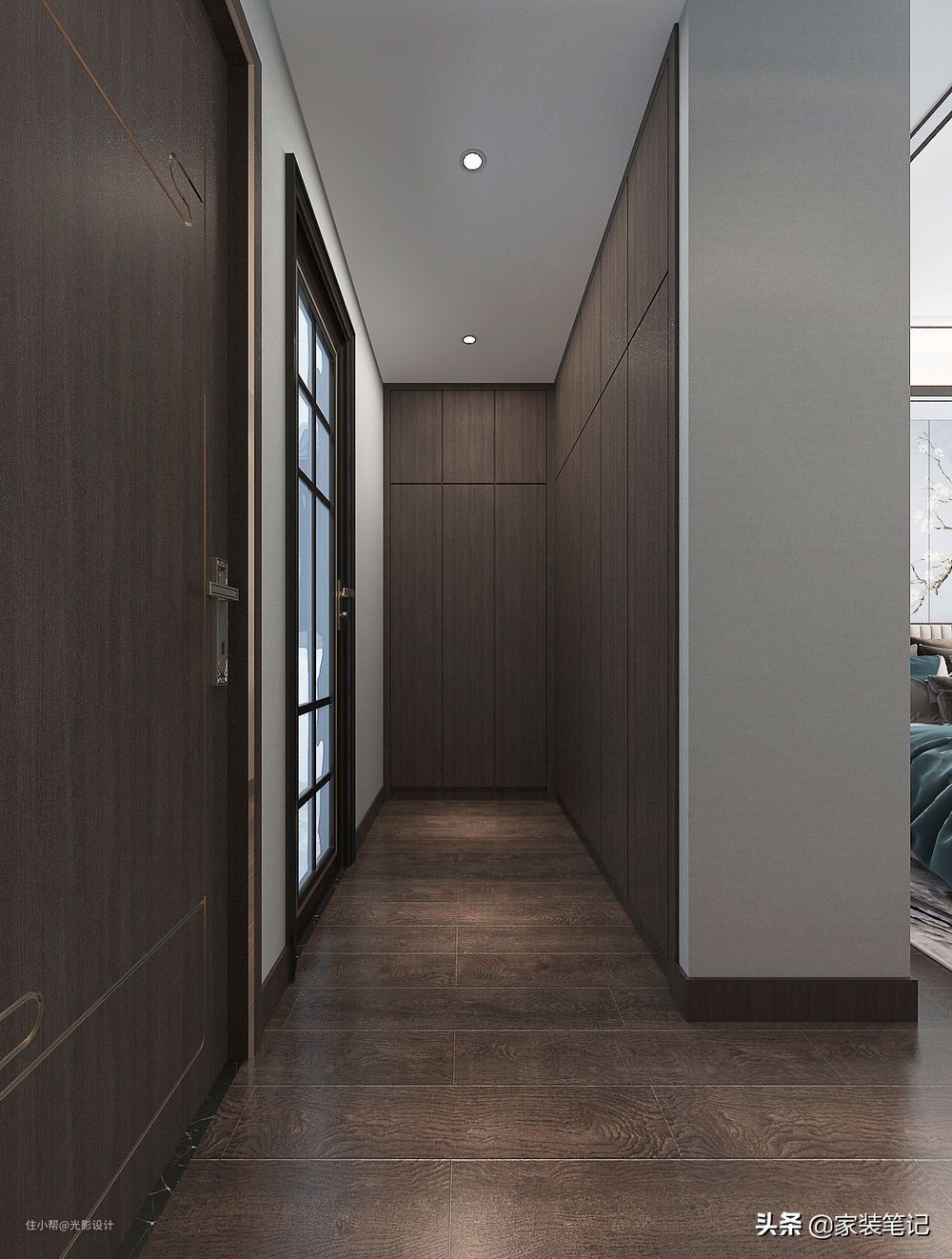 在主卧和主卫之间做了这样一个小衣帽间出来,既保证了卧室的收纳功能,又很好地避开了床正对主卫门的尴尬。衣柜柜门全部采用的无拉手设计,看上去很整体,也很好看。
