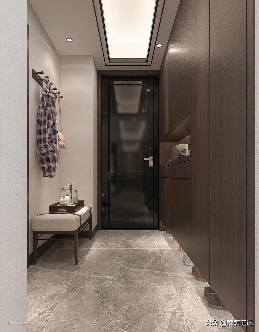 玄关左手边是一组鞋柜,因为在右边有地方来摆放换鞋凳,所以就没有在鞋柜上面预留部分出来做换鞋凳,来把鞋柜变成多功能柜。鞋柜设计的很人性化,很符合人体工程学,下面方便放常穿的鞋子,中间用来放进出门的钥匙和包包。
