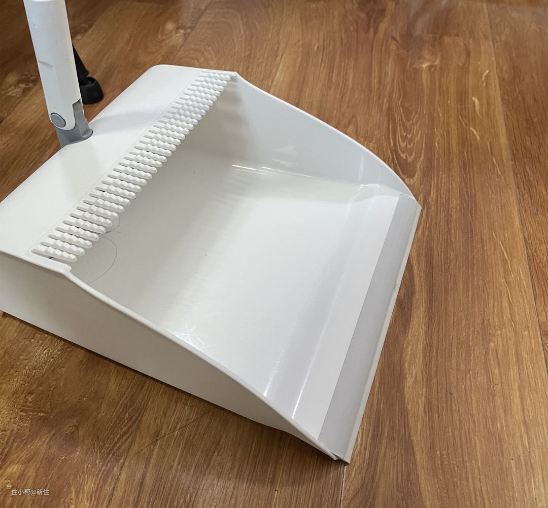 扫完地,再把碎屑,扫进簸箕的时候,又会发现簸箕跟地接触的地方,是一个小胶条,可以严丝合缝地贴在地上,避免碎屑、灰尘从底部漏到后面去。
