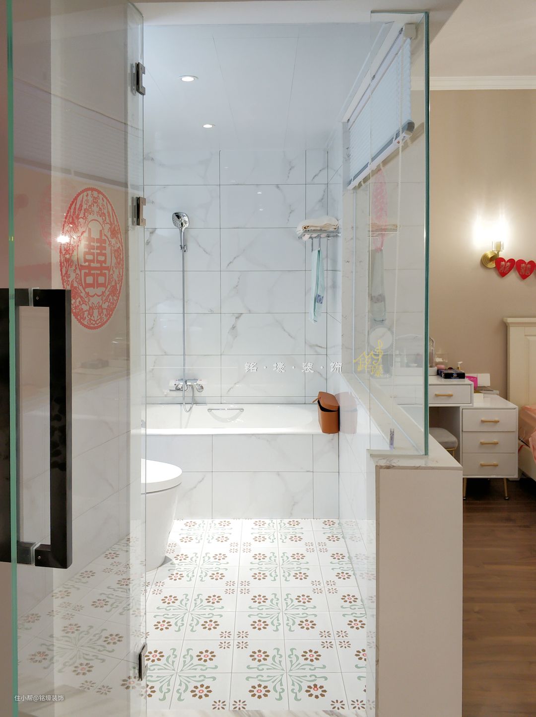 半开放式的设计,透明玻璃隔断,使主卧室空间连贯融通,显得宽敞明亮。爵士白的墙砖和文艺清新的小花砖使整个空间腔调十足。