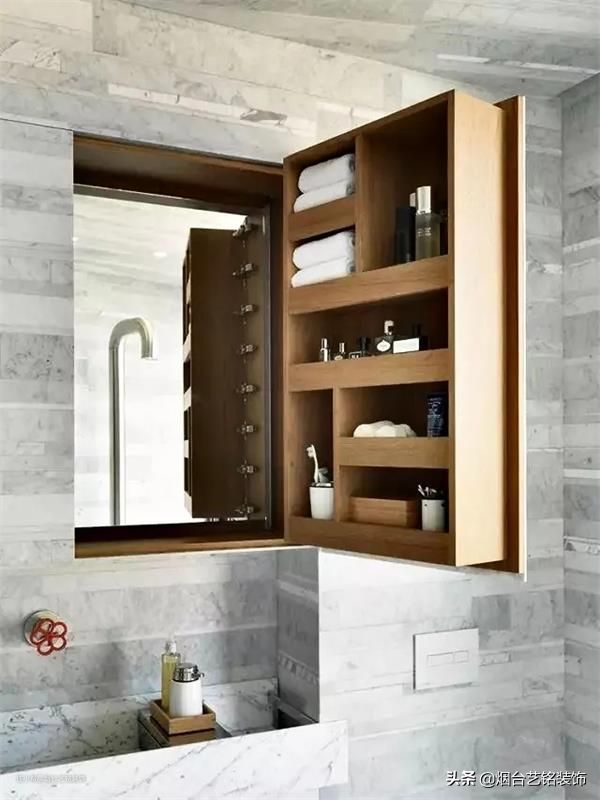 艺铭装饰 半封闭式镜柜:将镜柜中80%的部分做封闭处理,用于放置不常用的物品;20%的部分做开放处理,用于放置常用的洗漱用品,减少了开关柜门的麻烦。