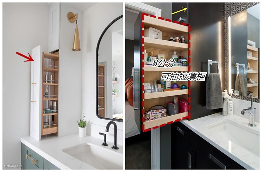 ①侧边空间做一组可抽拉的薄柜,用时拉开,物品一目了然,拿取便捷;