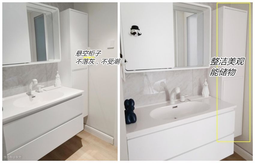③若卫生间空间足够,也可以直接在台盆旁侧,做一组悬空的薄柜,日常洗漱用品统统进柜,储物量翻倍,拿取方便。悬空设计也不用担心柜子受潮,很不错。