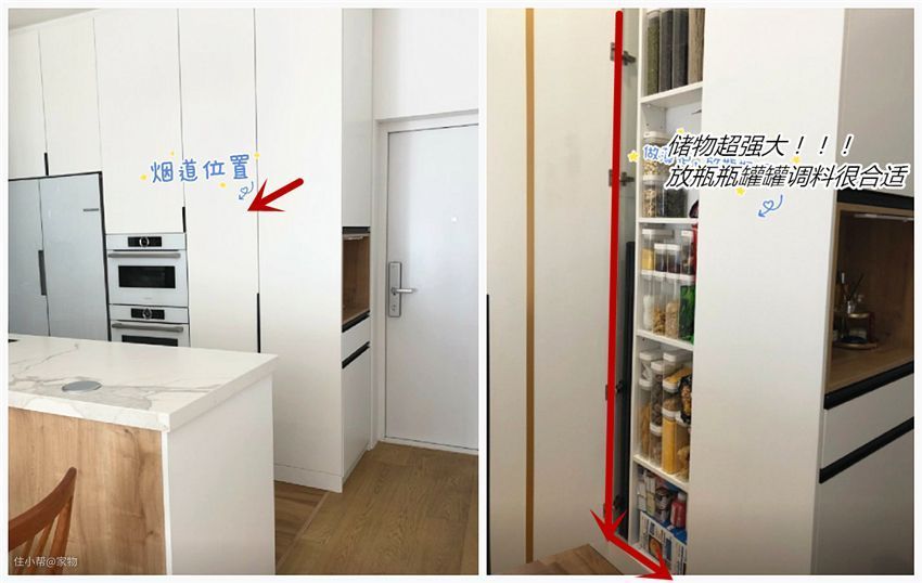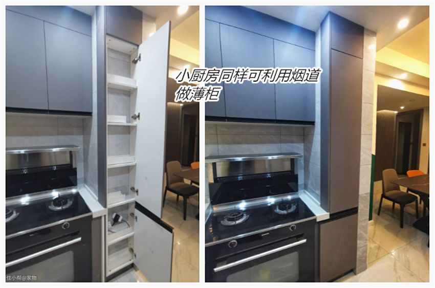 实际上,完全能在烟道区域做一组薄柜,用于放置瓶瓶罐罐的调味品,或者一些零散的杂物,大大提高了空间利用率。