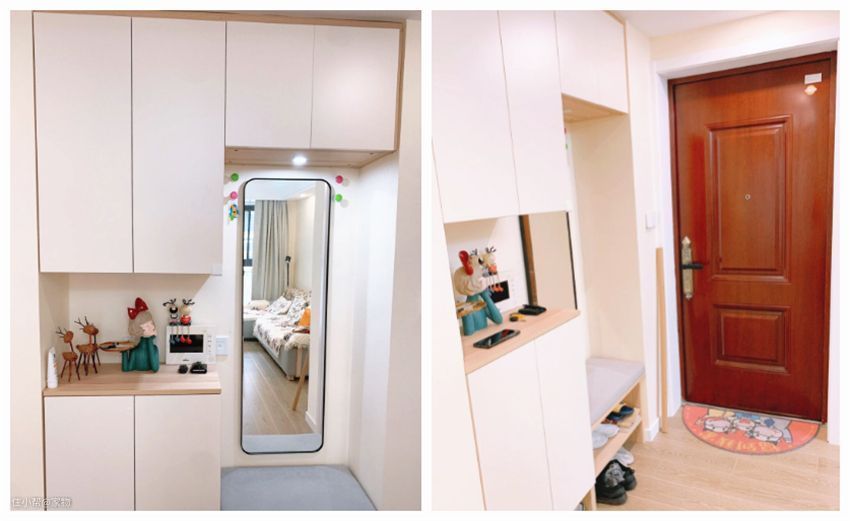 若有需求,柜门上加一面镜子,这里完全能作为迷你的化妆间,对无法摆放梳妆台的小房间来讲,这样的设计就特别友好。