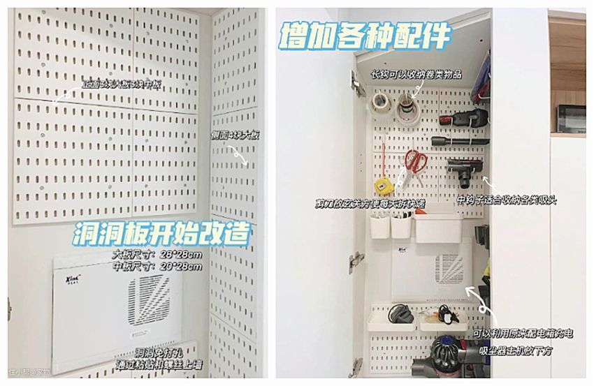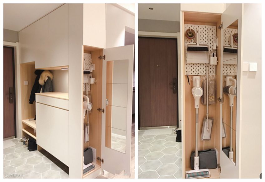 买一组洞洞板,和挂钩组合一下,将清洁用具悬挂收纳在薄柜内,美观又省空间。