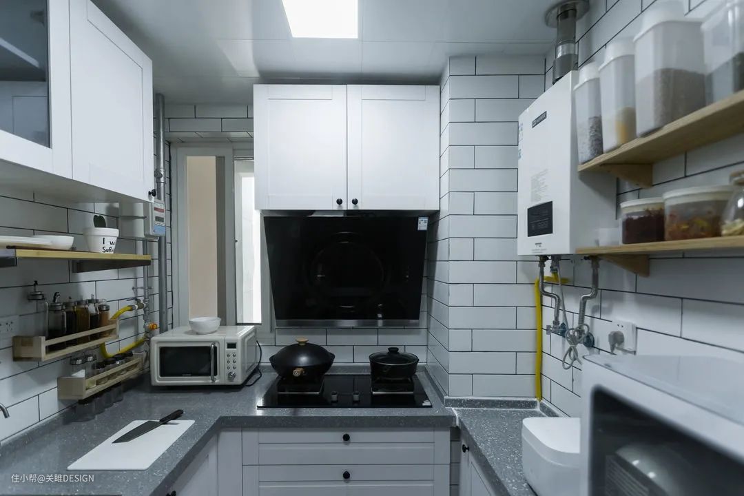 厨房虽小,但功能却很齐全,合理的设计,让拿→洗→切动线一气呵成。按照使用习惯对收纳进行设计,常用物品,顺手物品,备用物品做了三层收纳。上方吊柜放置备用物品,中部隔板放置顺手物品,底部橱柜放置常用重物,以此保持厨房干净整洁,与使用舒适。