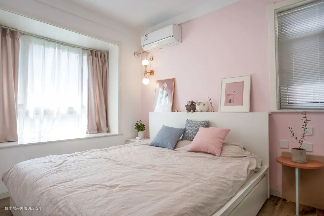 主卧少女心炸裂,粉色的床头简约与浪漫两种气息,在主卧空间和谐共处。考虑衣柜顶部落灰问题,主卧也做了通顶衣柜,提高空间利用率。白色烤漆门板,搭配黑色细长把手,简约又不失品质感。