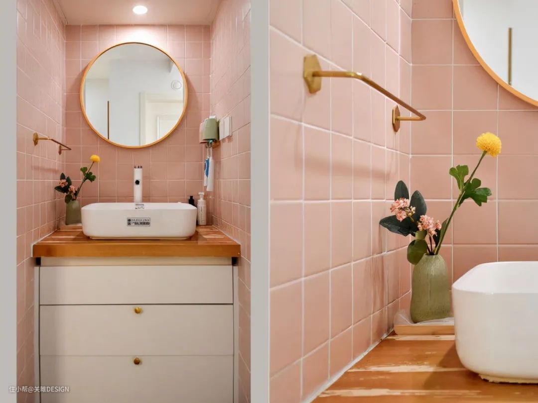 卫生间干湿两分离的设计,干区墙面用100x100小粉砖,满满的少女情怀。卫生间内部新建高度120cm墙体做淋浴隔断,搭配浴帘设计让空间更灵活。墙体上可放置常用的洗浴用品,利用多出来的拐角定制置物架,收纳脸盆及洗浴备用物品。
