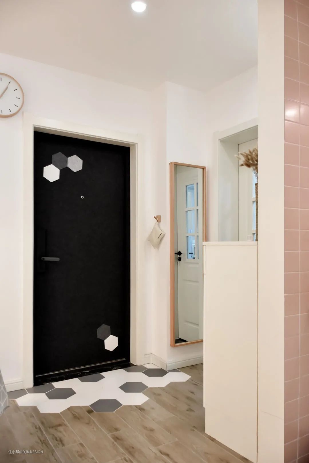 原有玄关动线不合理,空间逼仄。为了改善玄关功能,将玄关与餐厅对调,同时新建墙体并留出鞋柜位置。改造后不仅动线合理,空间也更加宽松舒适。鞋柜采用矮柜形式,柜体的宽80cm,高度110cm,不压抑又满足了收纳需求。地面加入了少量的六角砖,让空间更活泼。