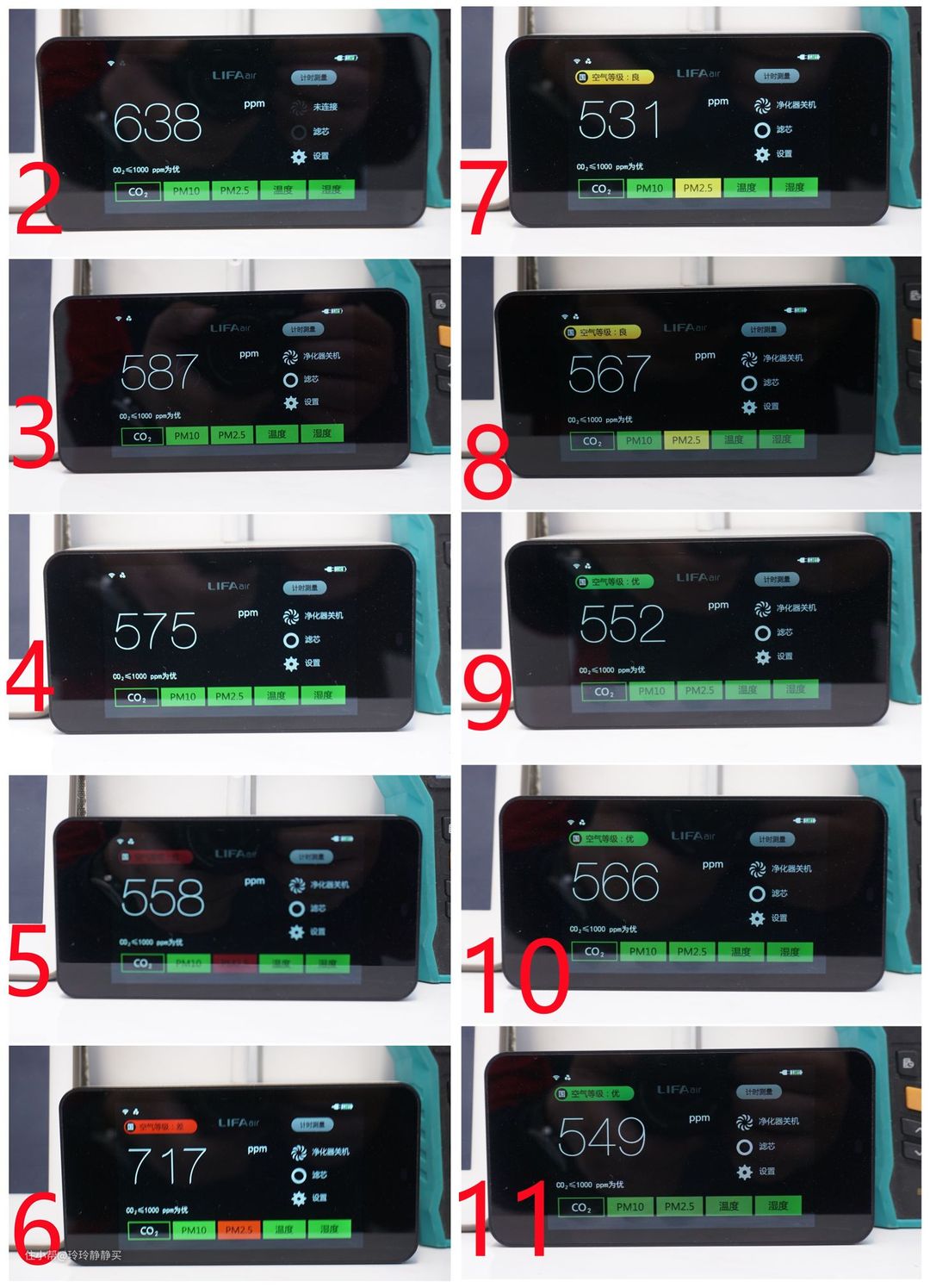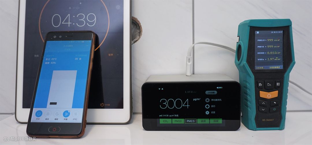 基础数据是PM2.5约3000μg/m³(以中间设备为准),VOCs约2μg/m³(看右面设备的最后一行)。CO₂值最开始忘拍照了,但能记住是850多ppm。