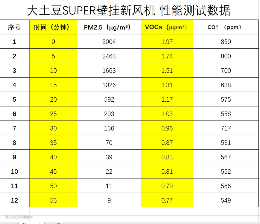 大土豆SUPER开到最高4档风力,每5分钟记录一次PM2.5和VOCs(一般挥发性有机物)的数据。看换气的效果。