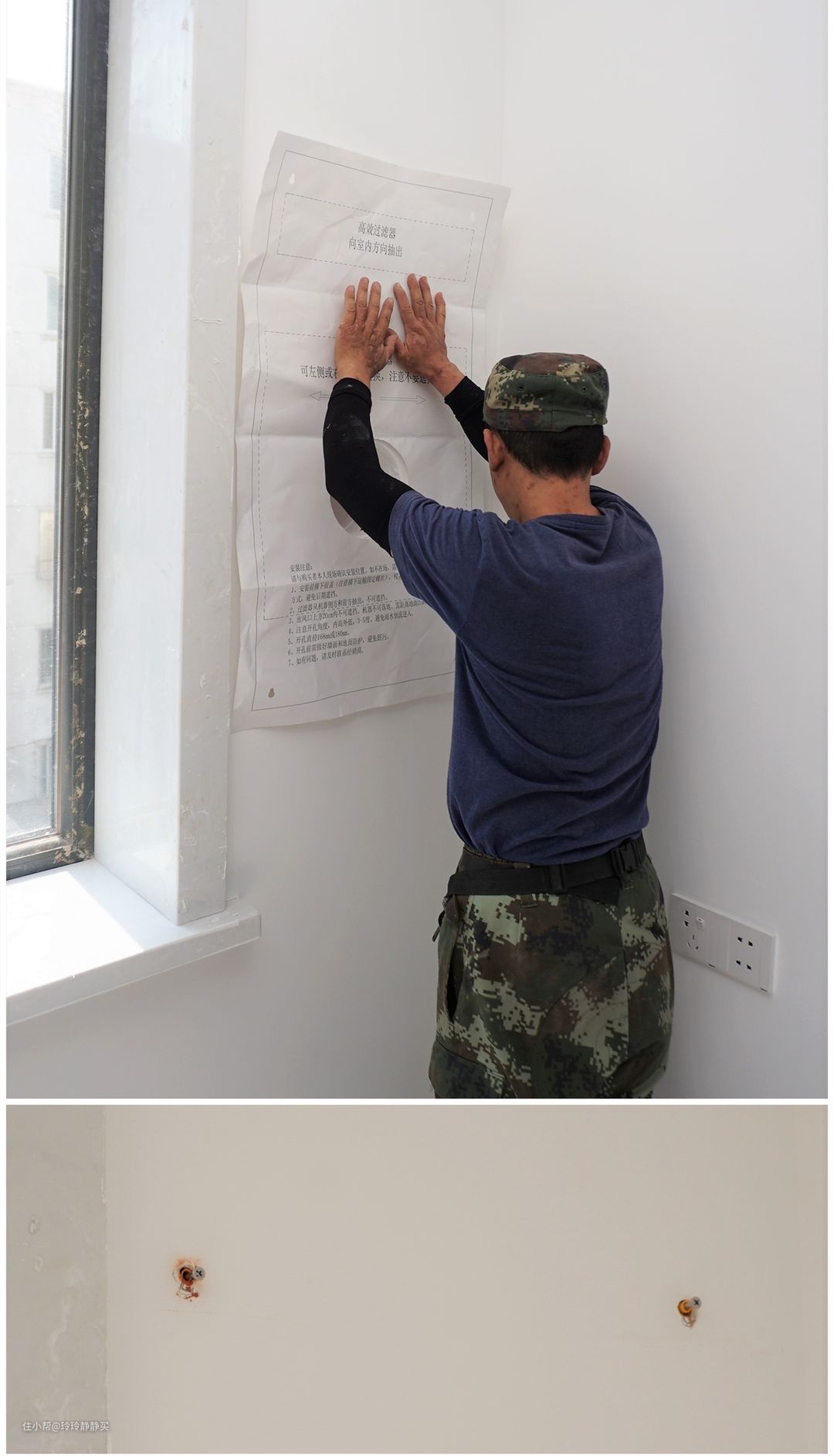 等到乳胶漆喷好,安装工再来安装机器。根据安装定位图打膨胀螺丝,再挂上机器就可以了。