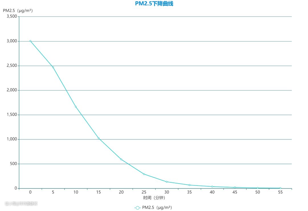 PM2.5下降情况,整体平稳,曲线平滑,前25分钟较快。后30分钟趋于平稳,也符合空气净化的常见规律。