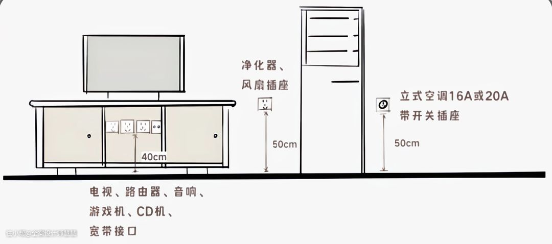 1️⃣沙发旁设置USB接口的五孔插座,方便手机充电💦。2️⃣入户使用双控开关,方便控制客厅灯光,🙌距离地面130cm最合适。🙌3️⃣空调插座一般为16A的三孔插座,高度根据使用的悬挂式或柜式决定。4️⃣在摆放电视或投影仪的位置预留出位置,🚩一般距离地面40cm,刚好嵌入电视柜。