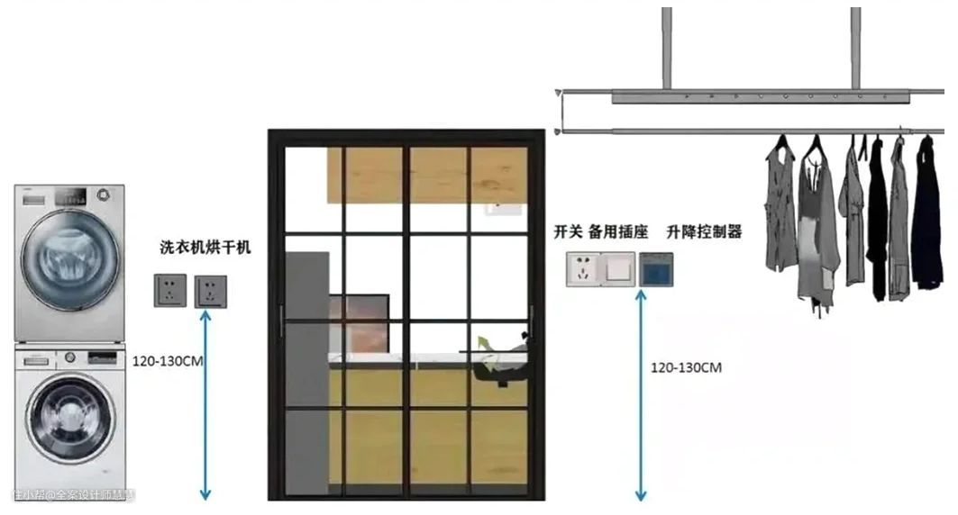 1️⃣洗衣机、烘干机插座得两个,建议离地100-200CM🤷♀️,吸尘器等设备备用插座得一个,建议离地200CM,🌹茶台插座得一个,建议离地40CM。2️⃣电动晾衣架插座得两个,建议离地120-200CM。🔆