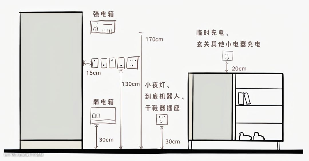 1️⃣进门一片漆黑,玄关灯帮你解决烦恼,🤷♂️配一个开关,距离地面130-140cm。2️⃣家里有扫地机器人的,💨需要留一个插座,距离地面30cm。3️⃣以防后期其他电器的需求,⭕建议再预留一个备用插座,距离地面130cm或30cm都可以。