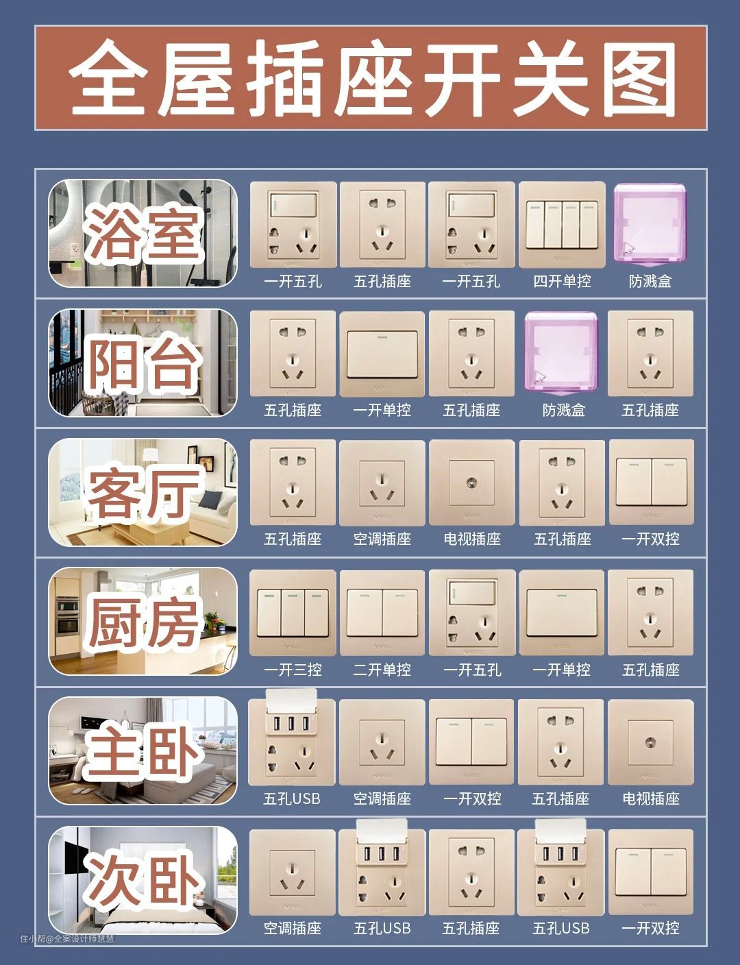 很多人在装修完毕之后才发现家里的插座不够用,😩但是这个时候再去改动也已经晚了..这时候很多人会选择用插线板来满足自己的点位需求,时间久了又会发现家里到处都是电线,相当不美观!😤 今天给大家整理出来一份全屋开关插座布局图, 虽然说能够满足到大部分小伙伴的需求,✨但是大家还是要在水电交底的时候去现场与师傅沟通哟!!插座的原则就是: 宁多勿少,适当预留‼