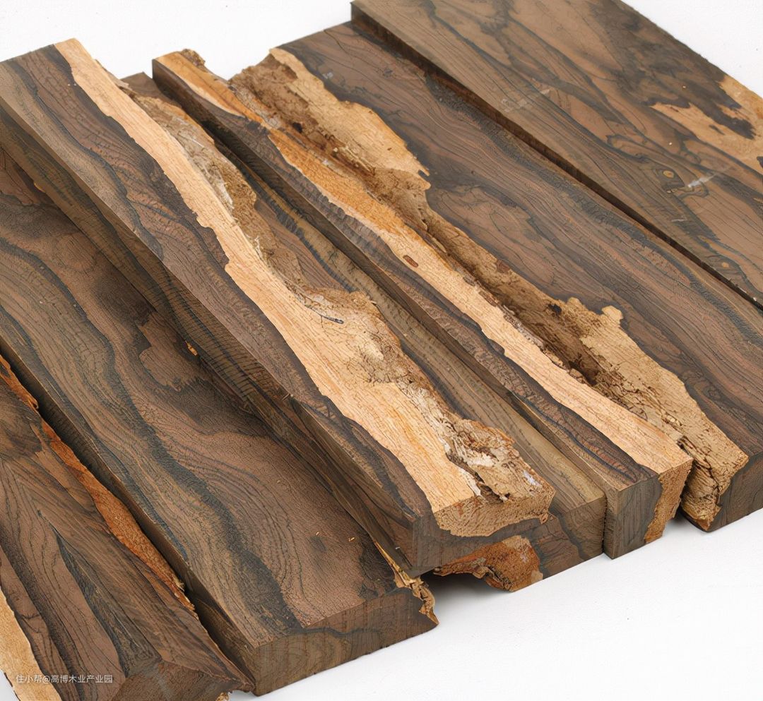 心材黑褐至黄紫褐,有的近黑色或常带黑色条纹。木材表面光泽好,手感润滑,摸上去缎子似的,亮里透光,颜色变化小,丝丝游动的黑色木纹若隐若现,含蓄而不张扬。