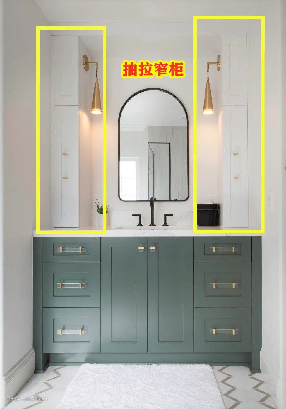 卫生间里做收纳,往往我们只会想到浴室柜和壁龛,可专业设计师就比我们想的要多,收纳点子也更多,在转角洗漱台上打上到顶窄柜,宽度10cm不到,不比浴室柜储物力差,再也不用烦恼卫生间储物空间不够的,跟着小易赶快学起来啦~~