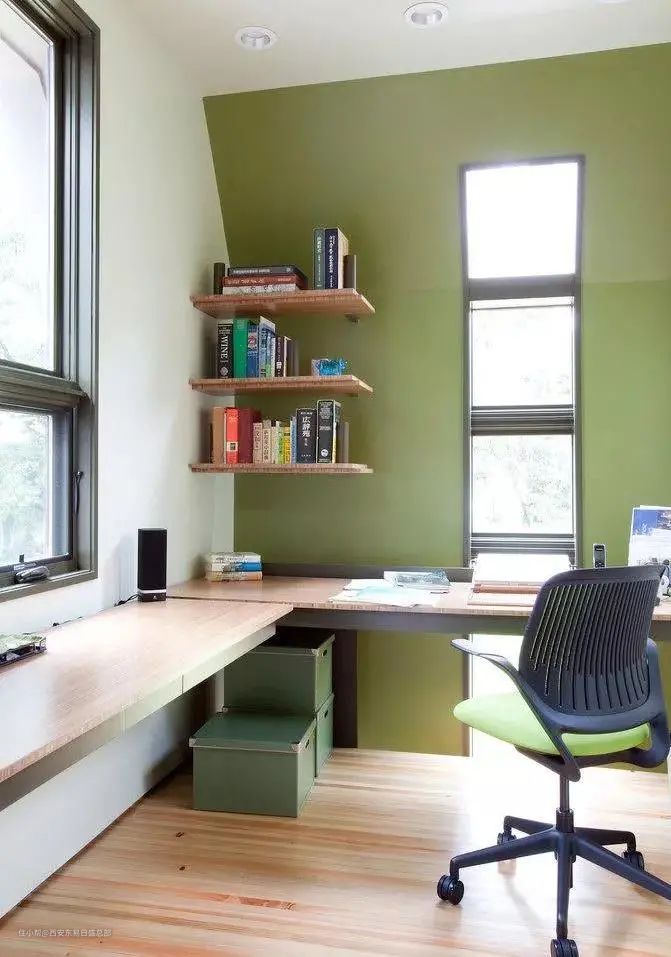 设计一个L形书桌,转角位置处的墙面作为书架,不仅宽敞舒适,如果有窗户,那更是自在自得了。