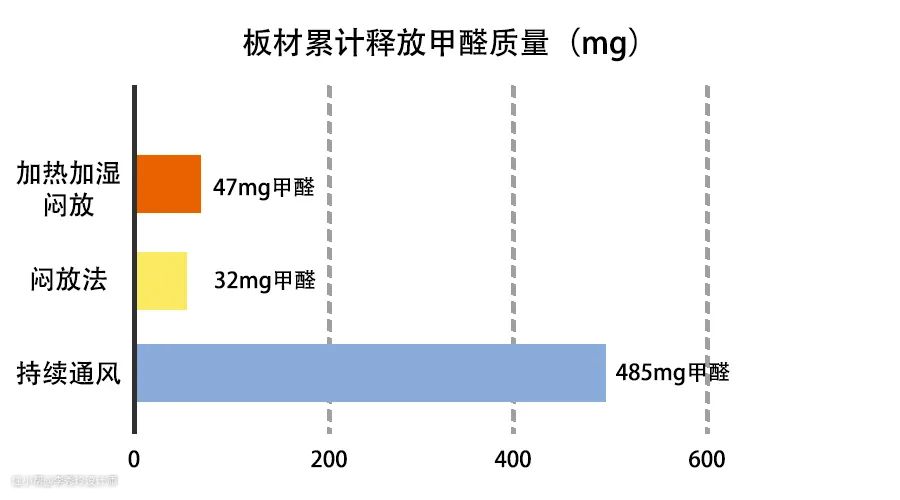 由图可见,在相同时间内,闷放后所释放的甲醛总量只有持续通风所释放的甲醛总量的1/10,但是加热加湿再闷放所释放的甲醛量略大于常温闷放所释放的甲醛量。