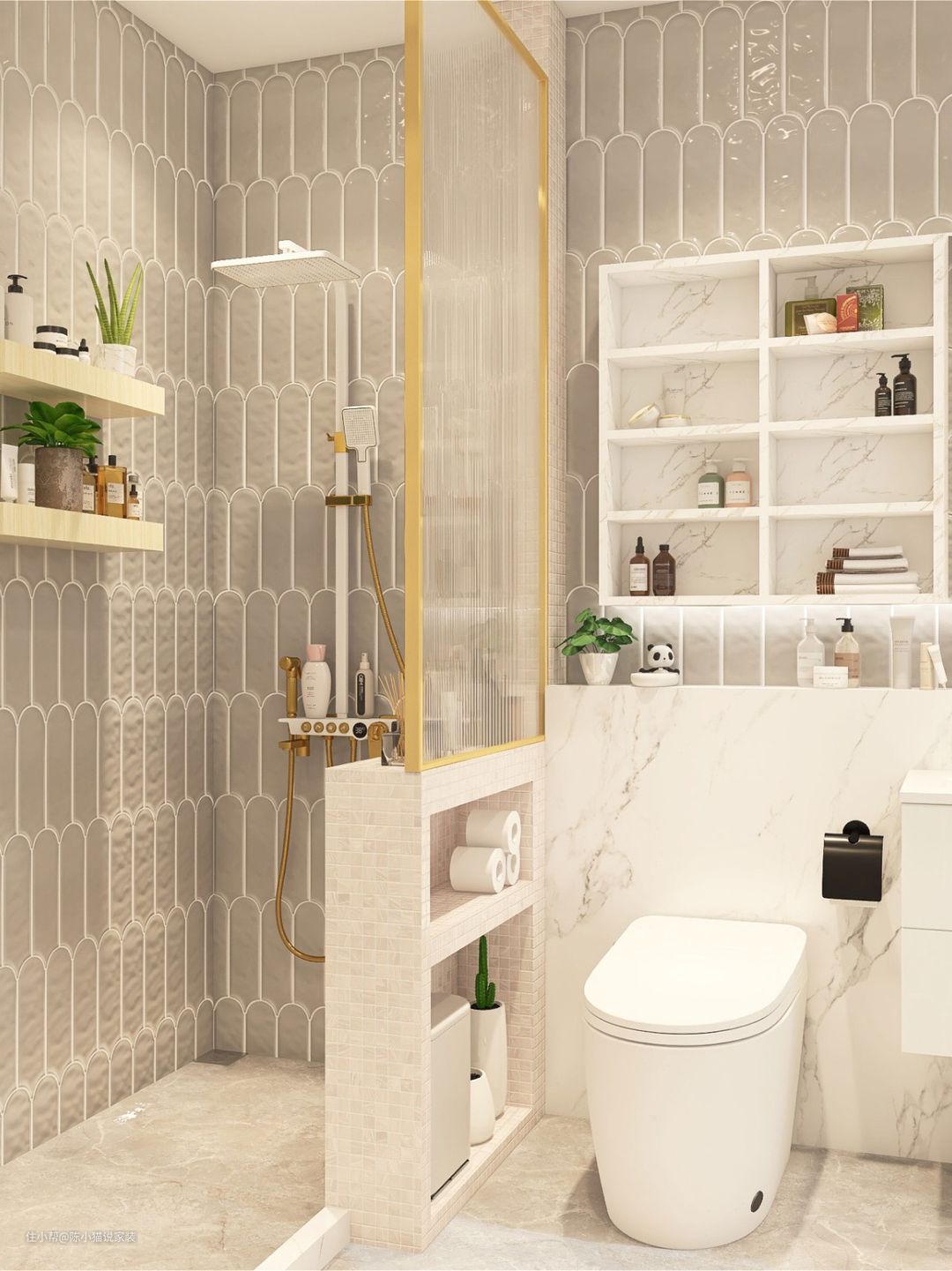 卫生间的面积最多的不是地面也不是顶面,而是装修时会经常忽略的墙面。其实卫生间可利用面积还是挺多的,比如设计壁龛,必看的施工比较简单,如果墙面厚度足够且不是承重墙体,掏空部分墙面再贴瓷砖即可。