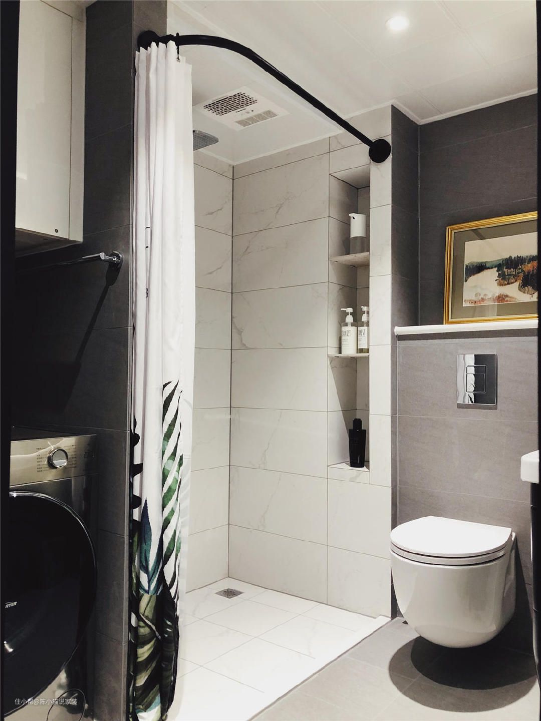 合理利用浴室挡水条,能让卫生间很有效地实现干湿分离。如果家里不做浴室和卫生间完全分开的设计,又觉得玻璃隔断显得脏,就可以考虑挡水条和浴帘的搭配。