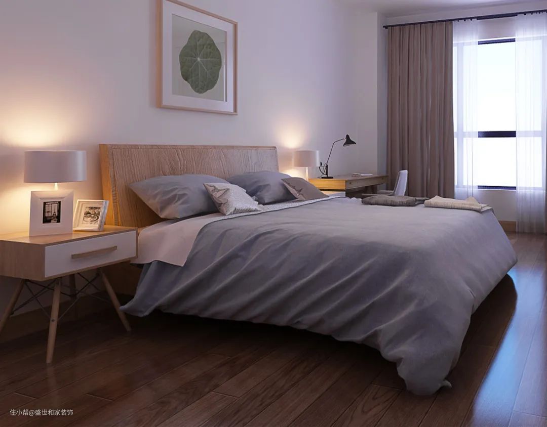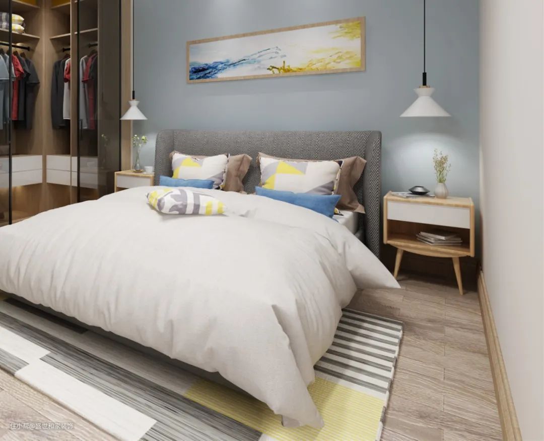 如果不是双人床的话,像1米5的床,也可以换成1.35米的,尺寸小一点点,又或是把床的一侧靠着墙摆放,就可以为卧室争取到摆放床头柜的位置。