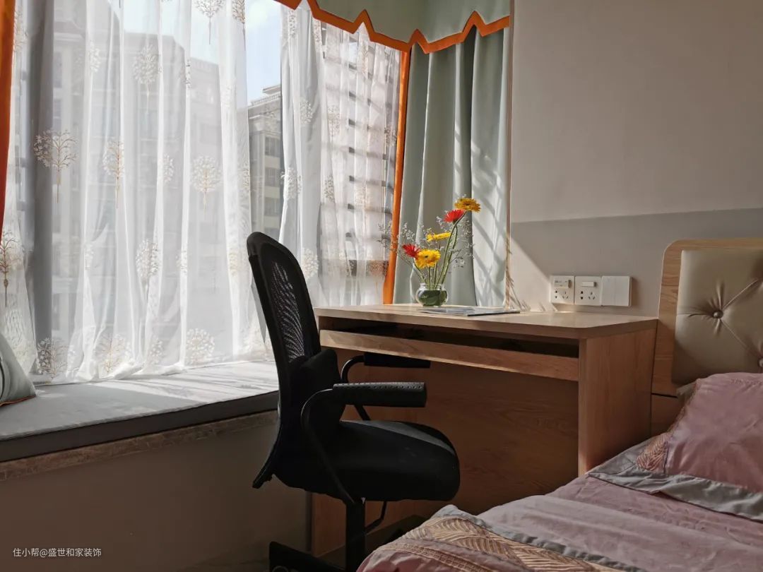 如果在床头旁边布置书桌或梳妆台的话,也可以让这个梳妆台充当床头柜的功能,通过组合的设计,让小空间的功能得以更加全面的实现。