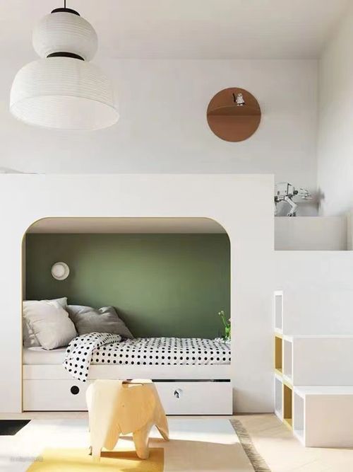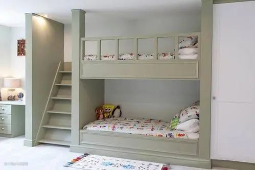 6、不同长短、错开的床,这样会减少下铺的压迫感,让空间布局拥有更多的可能,同时空出更多的收纳区域。