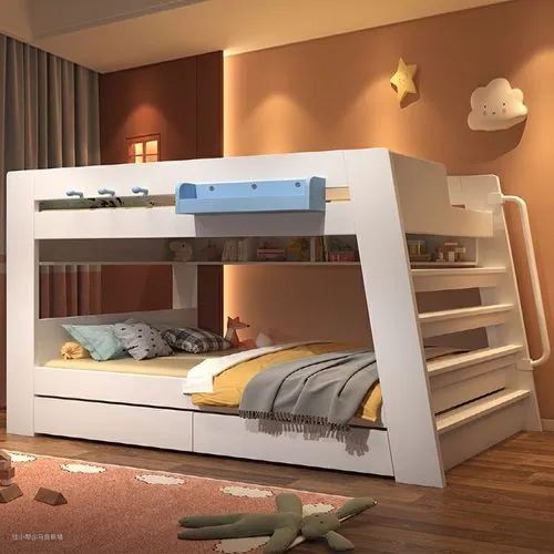 7、错开儿童上下床二号,这款设计就显得玩乐性更多啦!下部空间还空出来学习桌,墙体设置摆放枕边读物的隔层,除了连着墙体的区域,还有可爱的楼梯,惬意十足。