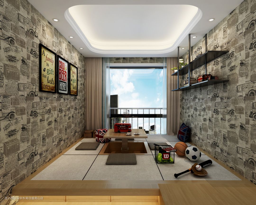 客厅背后的多功能房,以榻榻米做主设计,可升降台,可做茶室,亦可是儿童的玩乐区。将升降台收下,便是一个休息区。