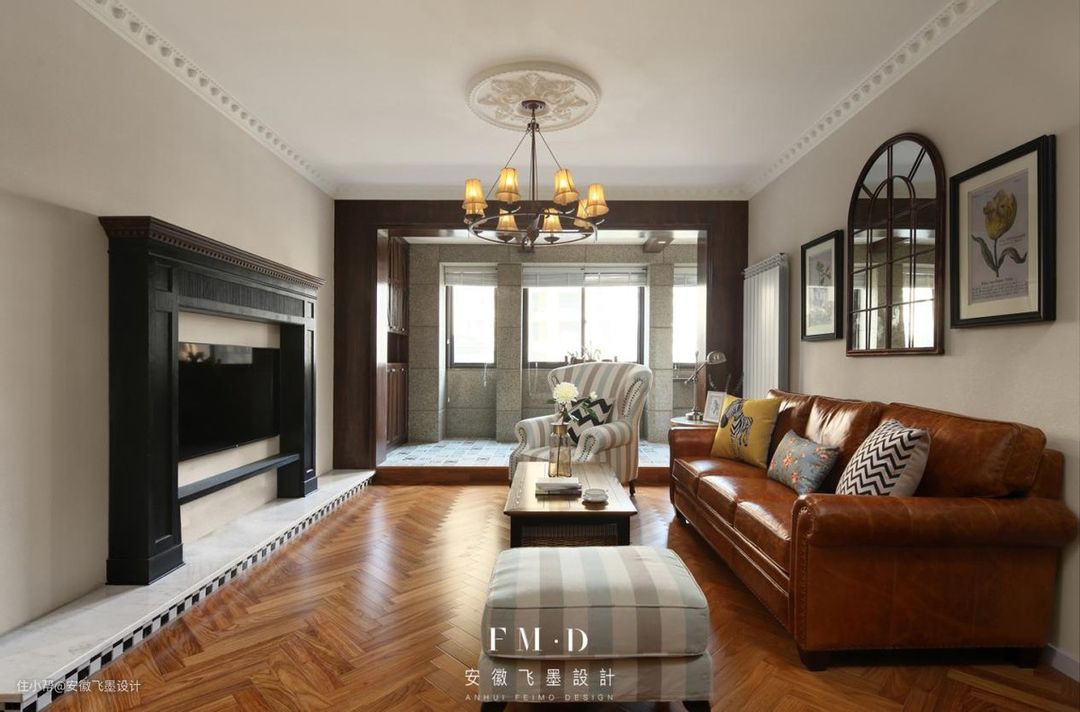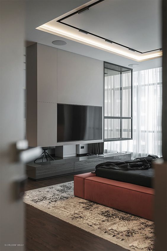 这种设计方式越来越常见了,一般都是安装雾化壁炉,所以要提前规划好地台的尺寸,在里面预留三插座电源,如果全自动加水款,还需要引入自来水管。不过在安装壁炉过后,建议对电视墙内做好整体的隔热,防止壁炉墙内的热量导致电视的电源老化。